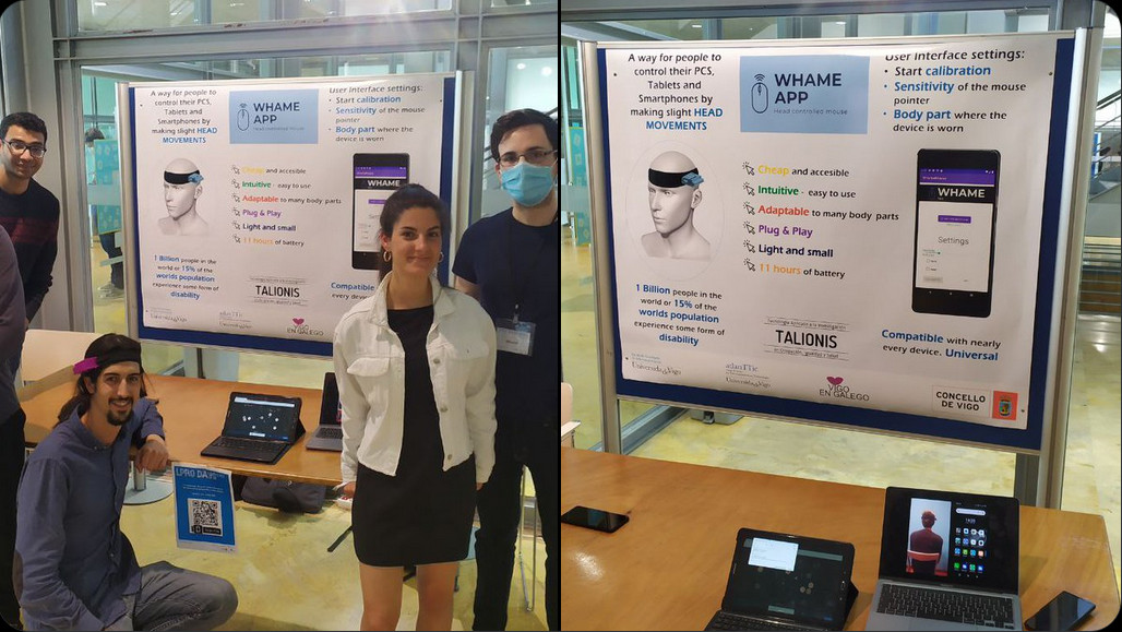 Este ano, dentro do programa de promoción da tecnoloxía para o ben común en escolas técnicas das universidades galegas (que financia Cooperación Galega da Xunta de Galicia), en colaboración co grupo Talionis da UDC (algún dos seus membros colabora no grupo de Tecnoloxía Inclusiva de ESF), se propuxo a un dos grupos a elaboración dun sistema que permita que persoas con diferentes discapacidades que restrinxen o seu movemento, poidan controlar o rato do ordenador en distintos dispositivos. É un xeito de facer esta tecnoloxía máis inclusiva. Así naceu WHAME app.